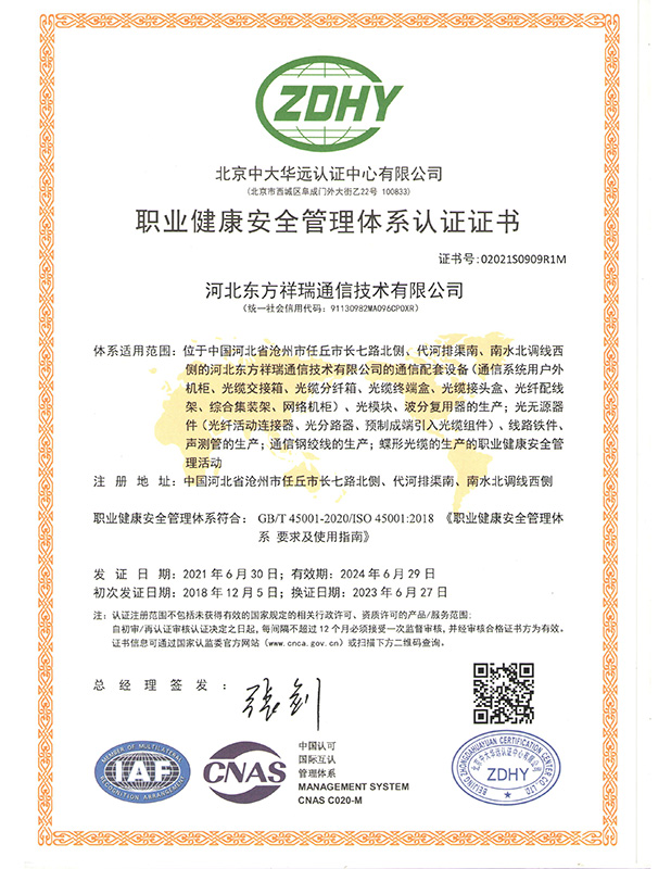 职业健康安全管理体系认证证书
